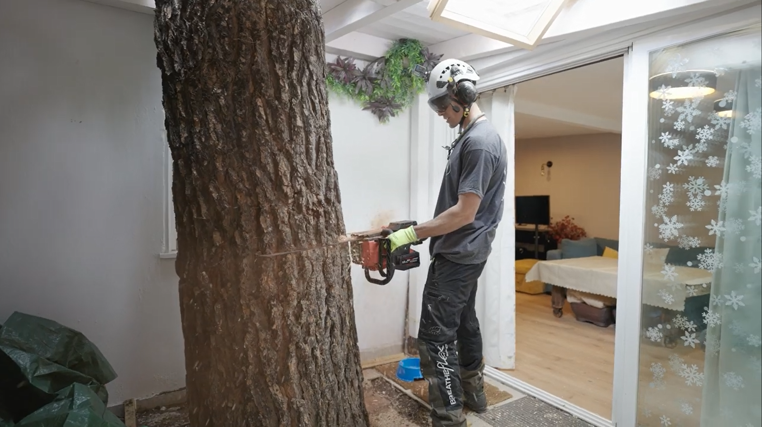 Toen de buitenste delen veilig waren verwijderd, ging het team binnen in de woning verder. Daar zaagden ze de boomdelen weg die door een bijgebouw waren gegroeid. In de nauwe ruimtes, met slechts 2 cm speling om de stam door het dak te verwijderen, kwam de precisie van de zaag volledig tot zijn recht.