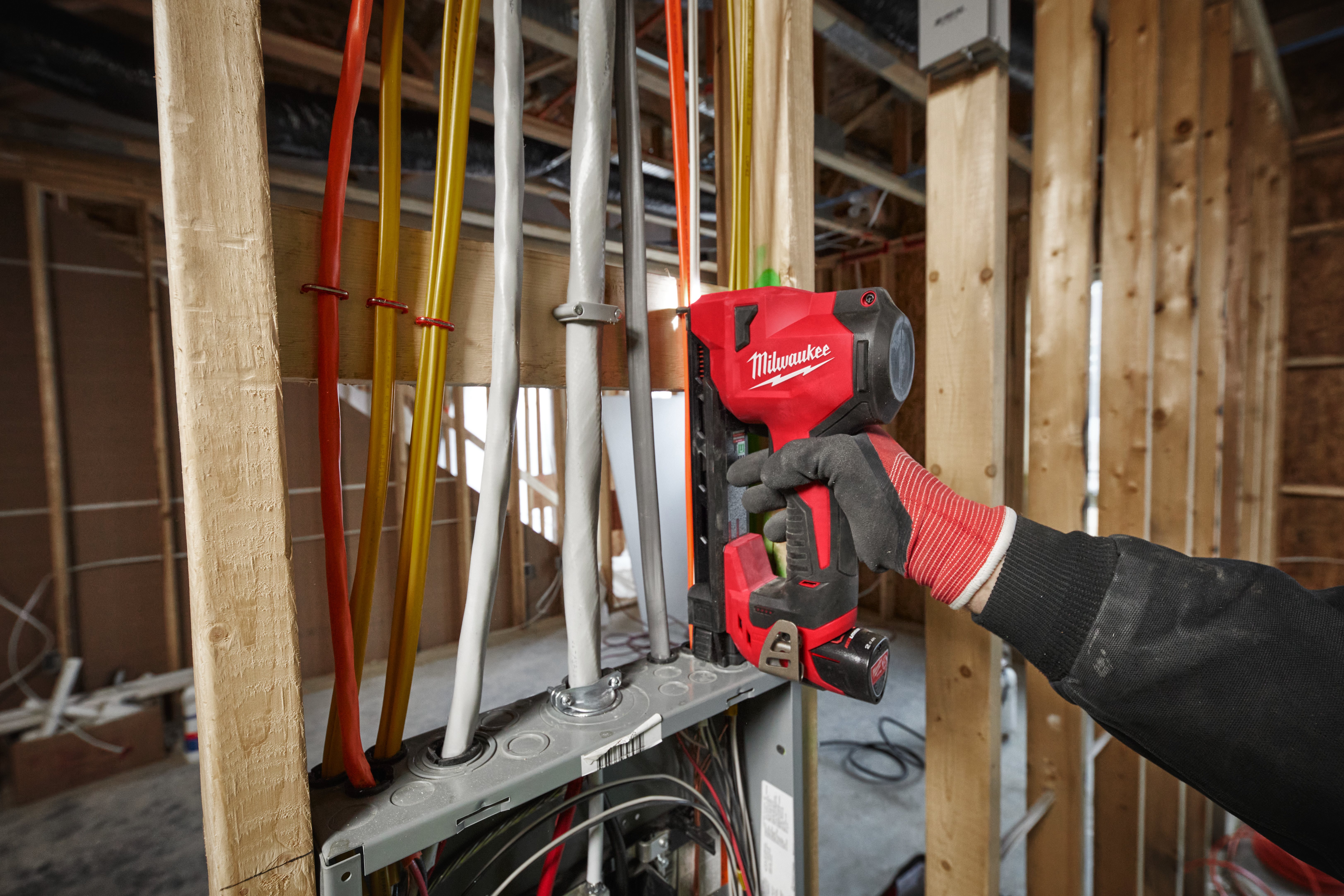 • De nieuwe kabelnietmachine op accu is twee keer zo snel als een handmatige nietmachine. Het elimineert het grootste deel van het handmatig nieten van laagspanninskabel in hout